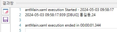 - 4번 과정에서 문자열로 변환한 DataTable을 '로그남기기'액티비티에 작성하여 확인합니다.