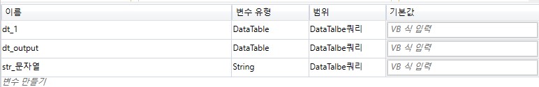 'DataTable 생성' 액티비티 사용하여 쿼리문의 OutPut을 받을 DataTable을 생성합니다.