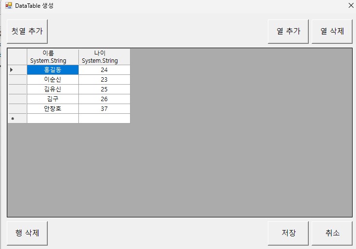 - DataTable생성 버튼을 클릭하여 DataTable을 생성합니다.