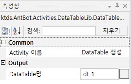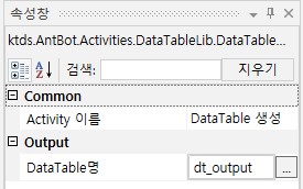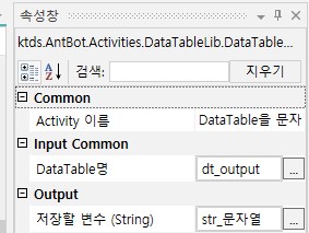 | 결과 DataTable 지움* | Input DataTable 내부 데이터를 지울지 여부를 설정합니다 | 체크박스 | 미체크 | 체크 : Input DataTable에서 추출한 값을 지웁니다. 미체크 : Input DataTable에서 추출한 값을 지우지 않습니다. |