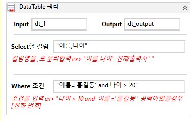 - DataTable 대상으로 쿼리 형식으로 특정 값을 추출하는 Activity입니다.