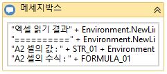 "엑셀 읽기 결과" + Environment.NewLine + "==========" + Environment.NewLine + "A2 셀의 값 : " + STR_01 + Environment.NewLine + "A2 셀의 수식 : " + FORMULA_01실행 결과 확인